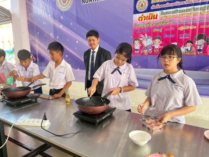 นำโดยนายอดิศร เพ็ชรจรูญ ผู้อำนวยการโรงเรียน คณะครูและนักเรียน ร่วมกันจัดกิจกรรมพัฒนาผู้เรียน ”กิจกรรมชุมนุมทักษะอาชีพ“ ประจำปีการศึกษา 2568 ในกิจกรรมมีการแข่งขันการประกอบอาหาร (ผัดกะเพรา) และการจำหน่ายสินค้าของระดับชั้น ประถมศึกษา เพื่อฝึกทักษะให้ผู้เรียนมีพื้นฐานและการทำงาน ส่งเสริมให้นักเรียนมีโอกาสค้นพบความสนใจและความถนัด ของตนเองได้เรียนรู้และการลงมือปฏิบัติจริง |