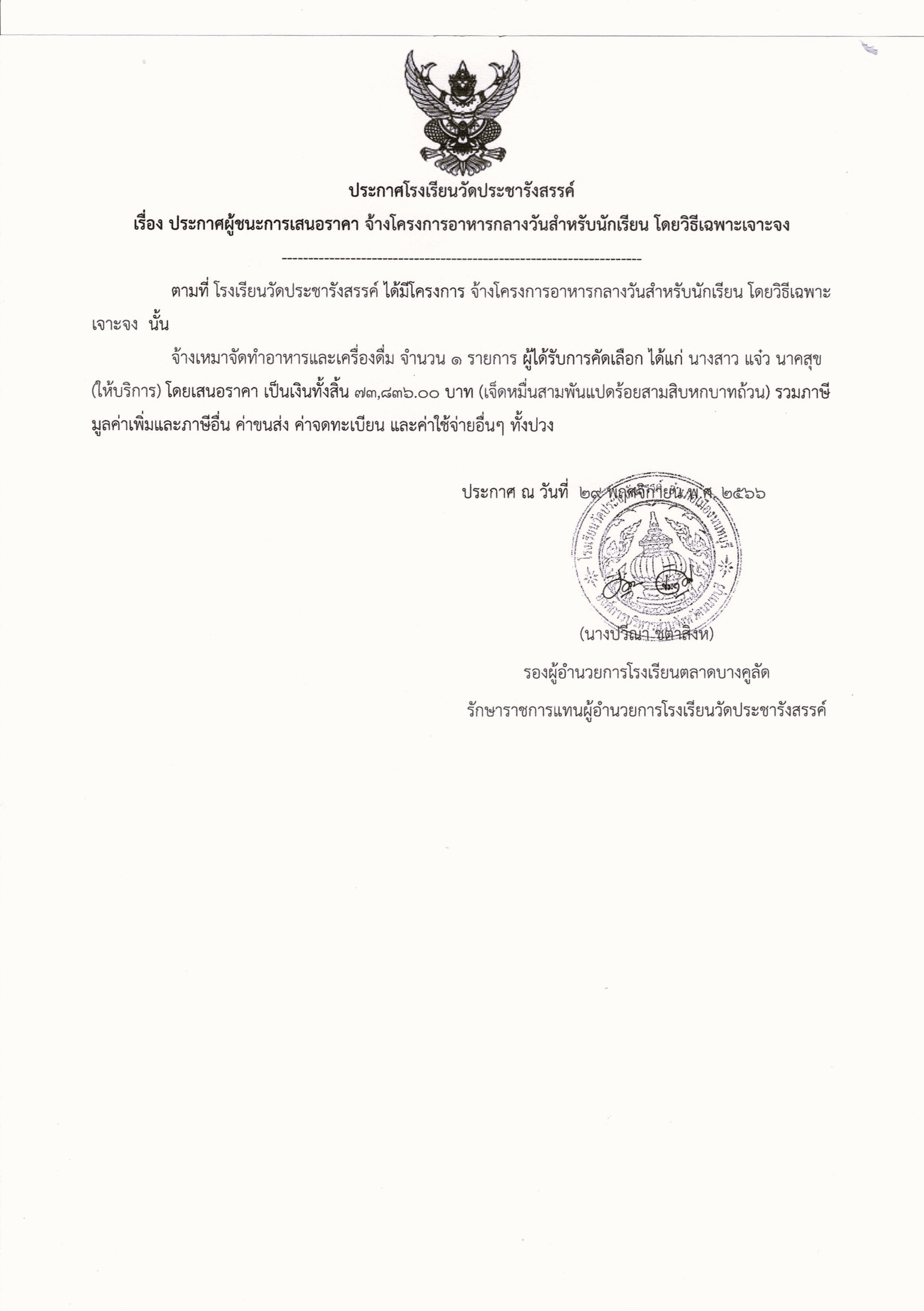 ประกาศผู้ชนะการเสนอราคา จ้างเหมาอาหารกลางวันโครงการอาหารกลางวันนักเรียน โดยวิธีเฉพาะเจาะจง