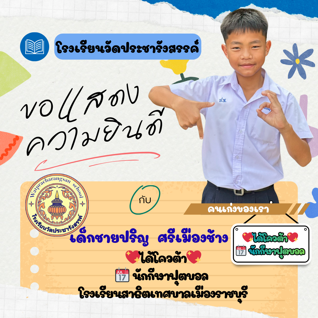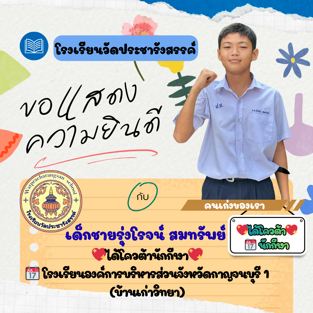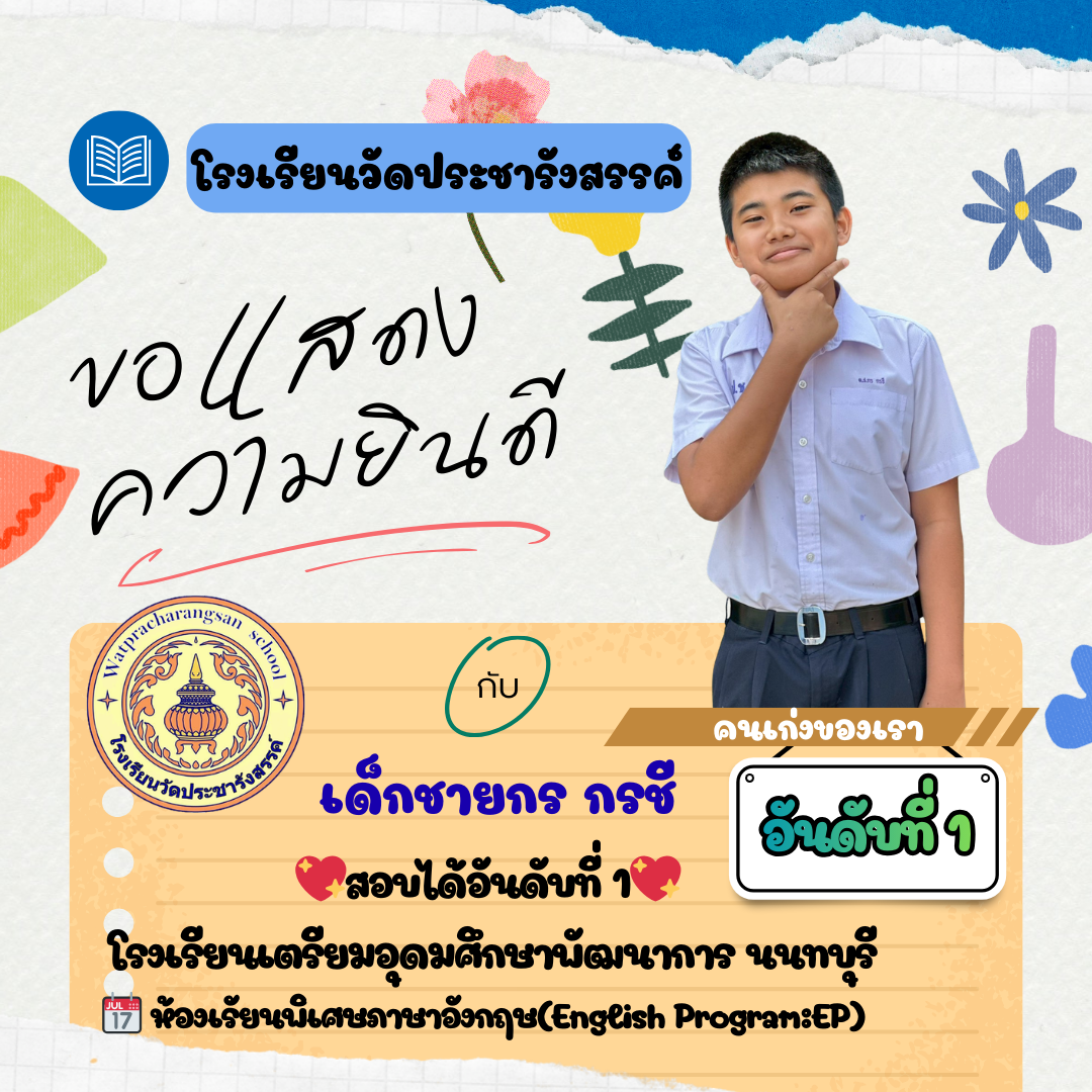 ร่วมแสดงความยินดีกับคนเก่ง...วัดประชารังสรรค์ โรงเรียนวัดประชารังสรรค์ขอแสดงความยินดีกับ เด็กชายกร กรชี นักเรียนชั้นประถมศึกษาปีที่ 6/1 ในโอกาสที่คว้ารางวัลคะแนนสูงสุดอันดับที่ 1 รายวิชาภาษาอังกฤษ (ประเภทห้องเรียนปกติ)