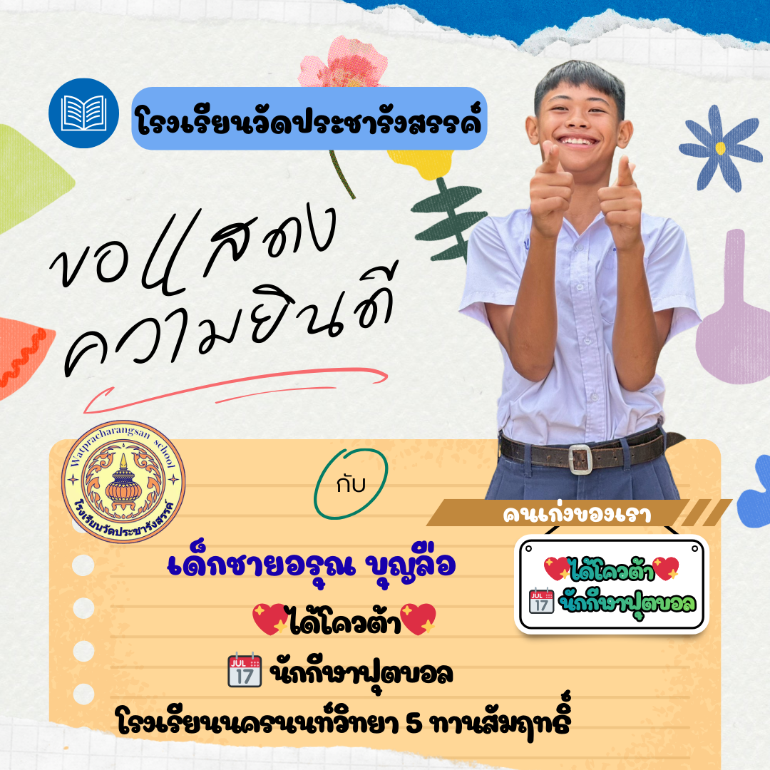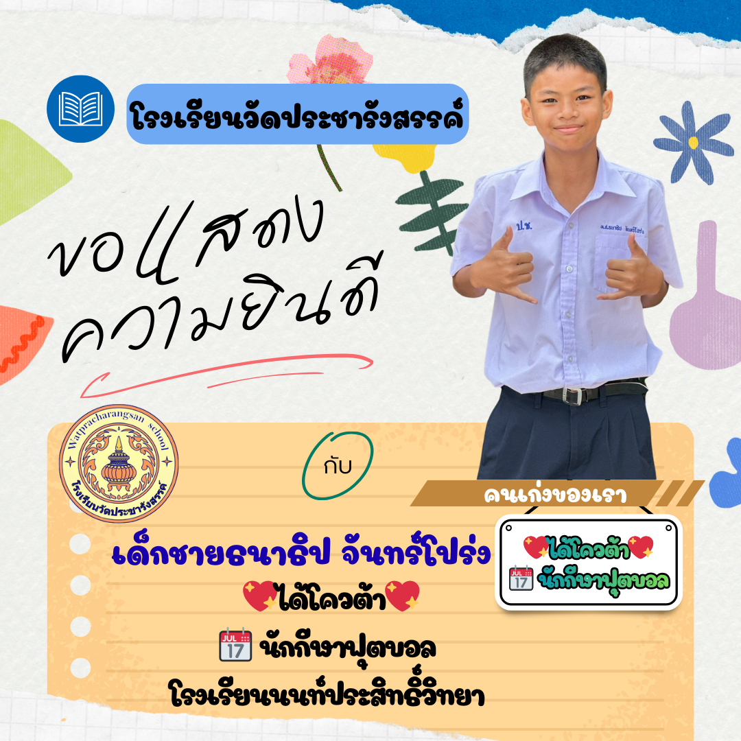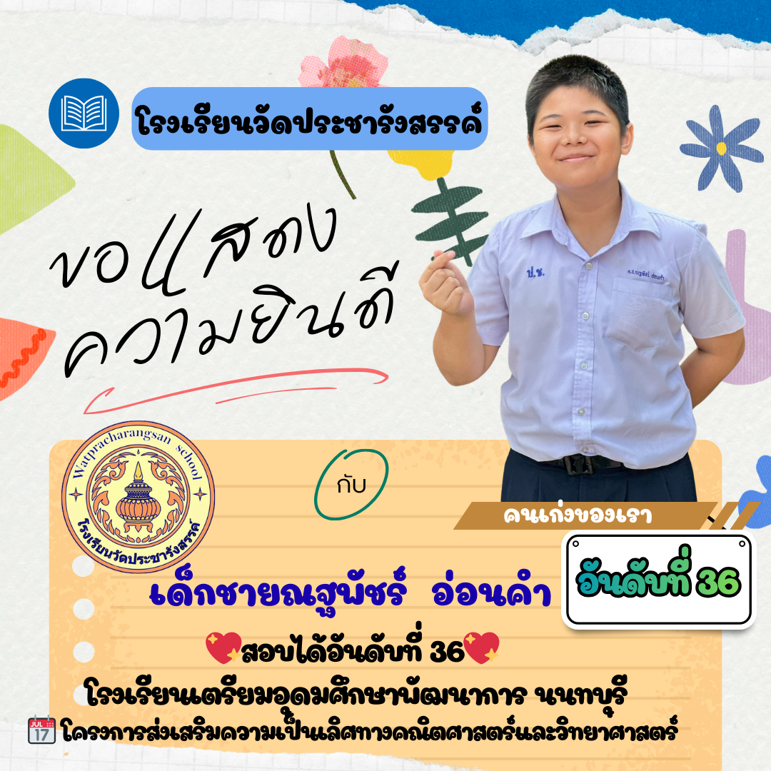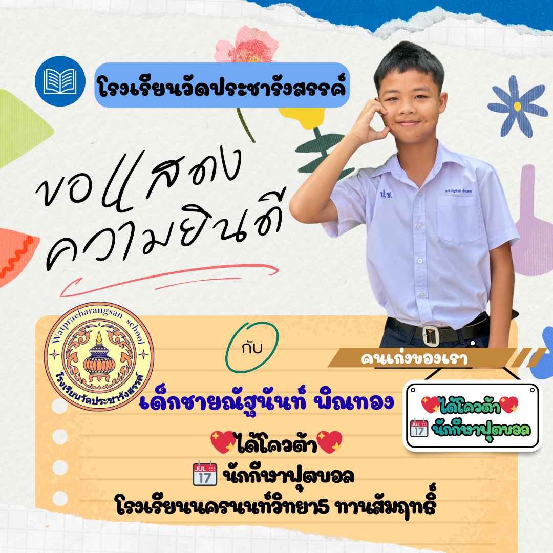 ร่วมแสดงความยินดีกับคนเก่ง...วัดประชารังสรรค์ โรงเรียนวัดประชารังสรรค์ขอแสดงความยินดีกับ เด็กชายกร กรชี นักเรียนชั้นประถมศึกษาปีที่ 6/1 ในโอกาสที่คว้ารางวัลคะแนนสูงสุดอันดับที่ 1 รายวิชาภาษาอังกฤษ (ประเภทห้องเรียนปกติ)
