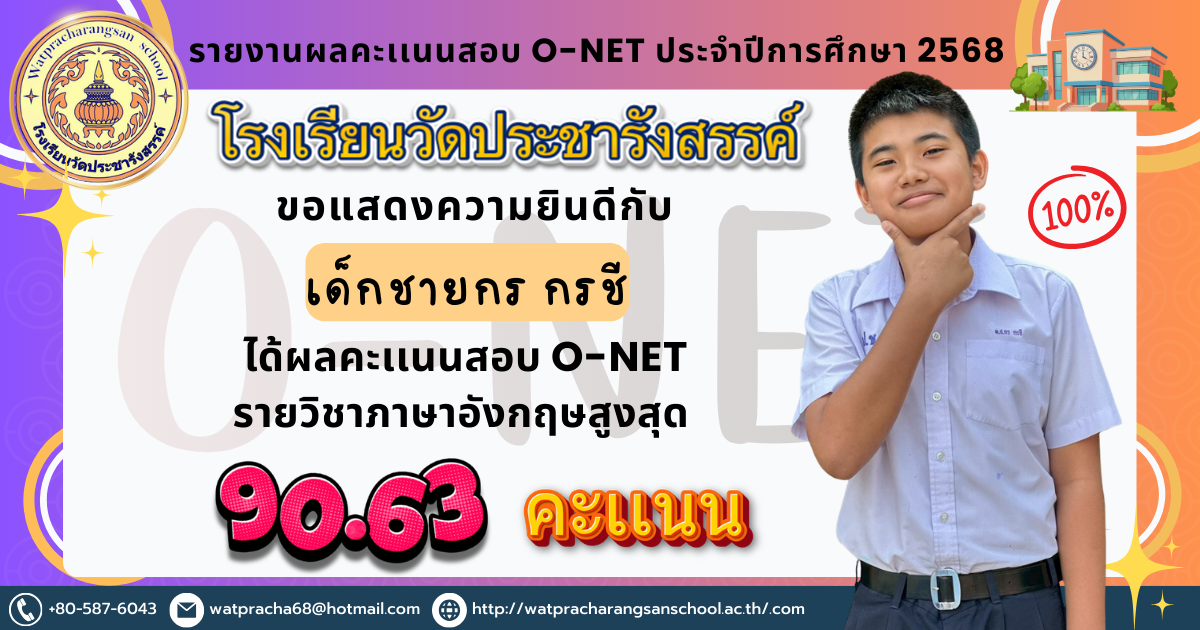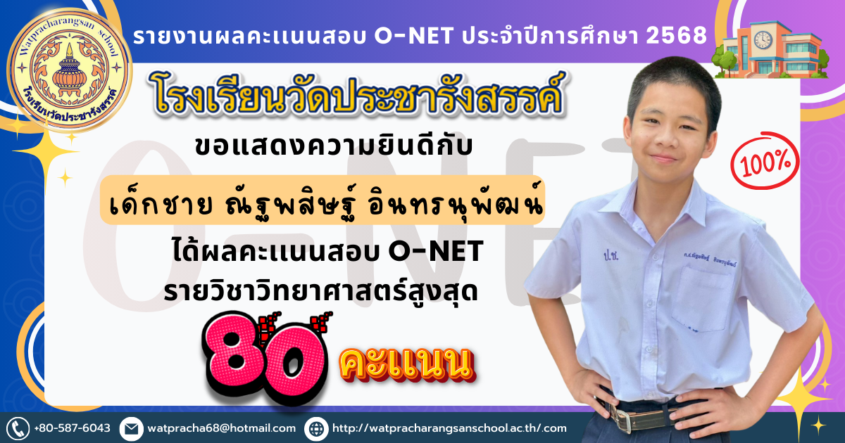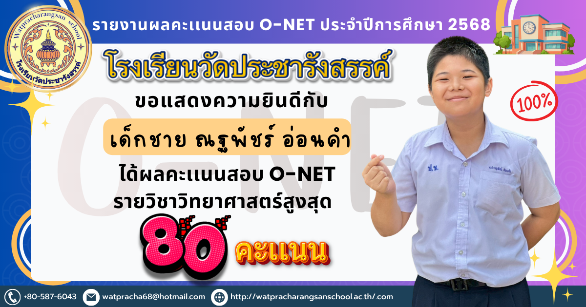 เด็กชายณฐพัชร์ อ่อนคำ นักเรียนที่ทำคะแนน O-NET ได้คะแนนรายวิชาวิทยาศาสตร์สูงสุด 80 คะเเนน